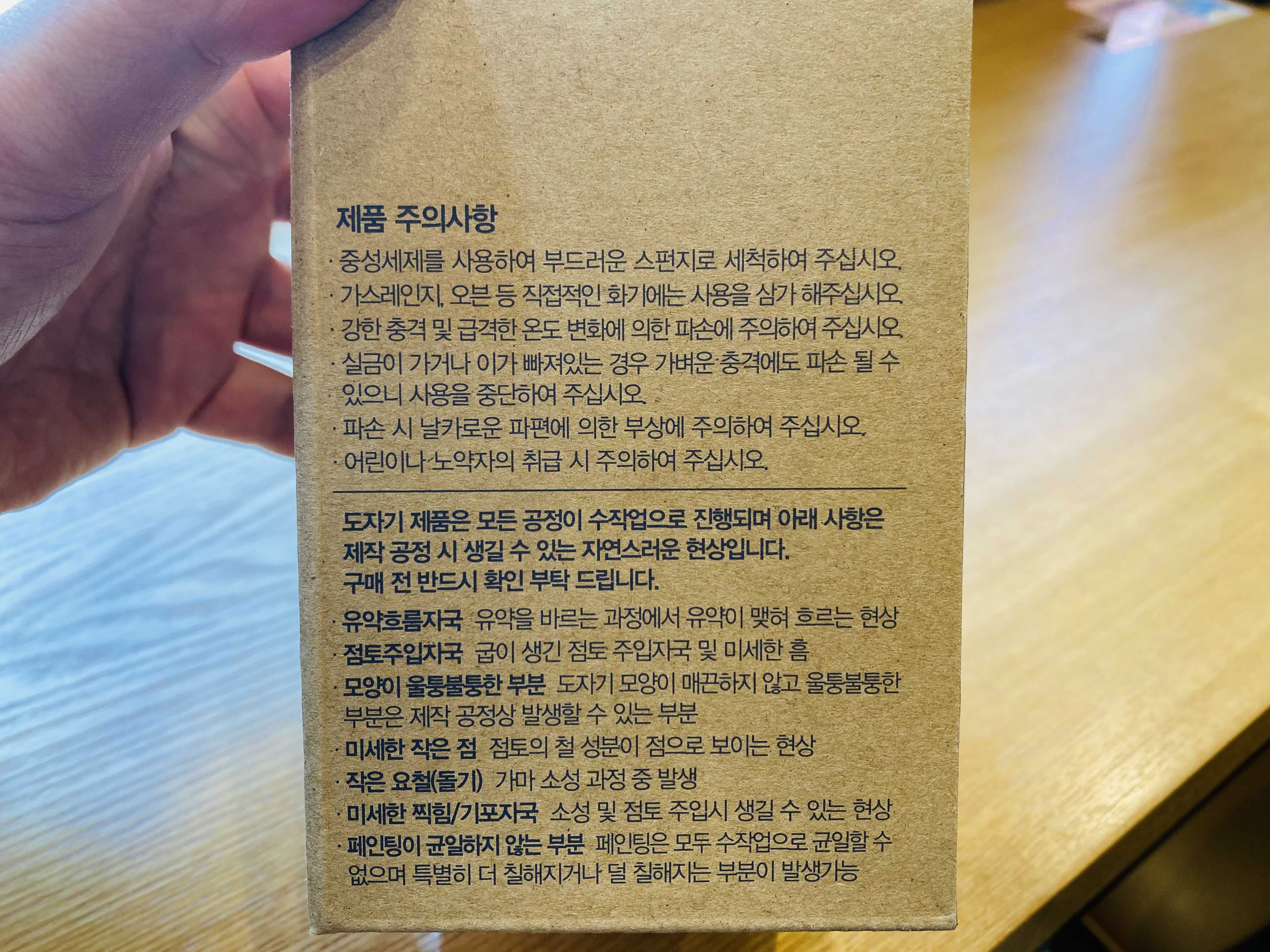 머그컵에 대한 주의사항이 상자에 적혀있습니다.
